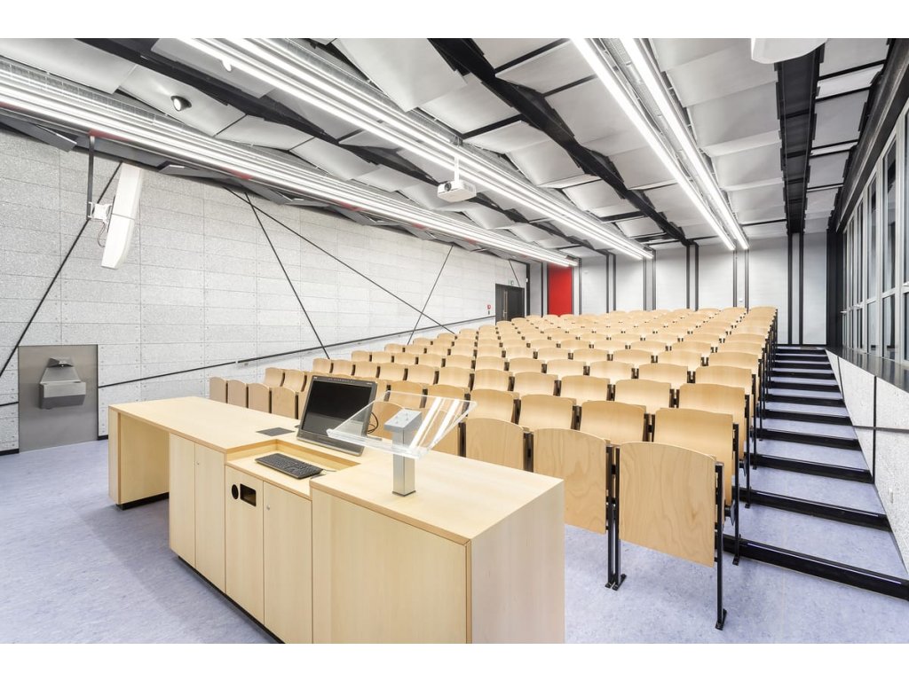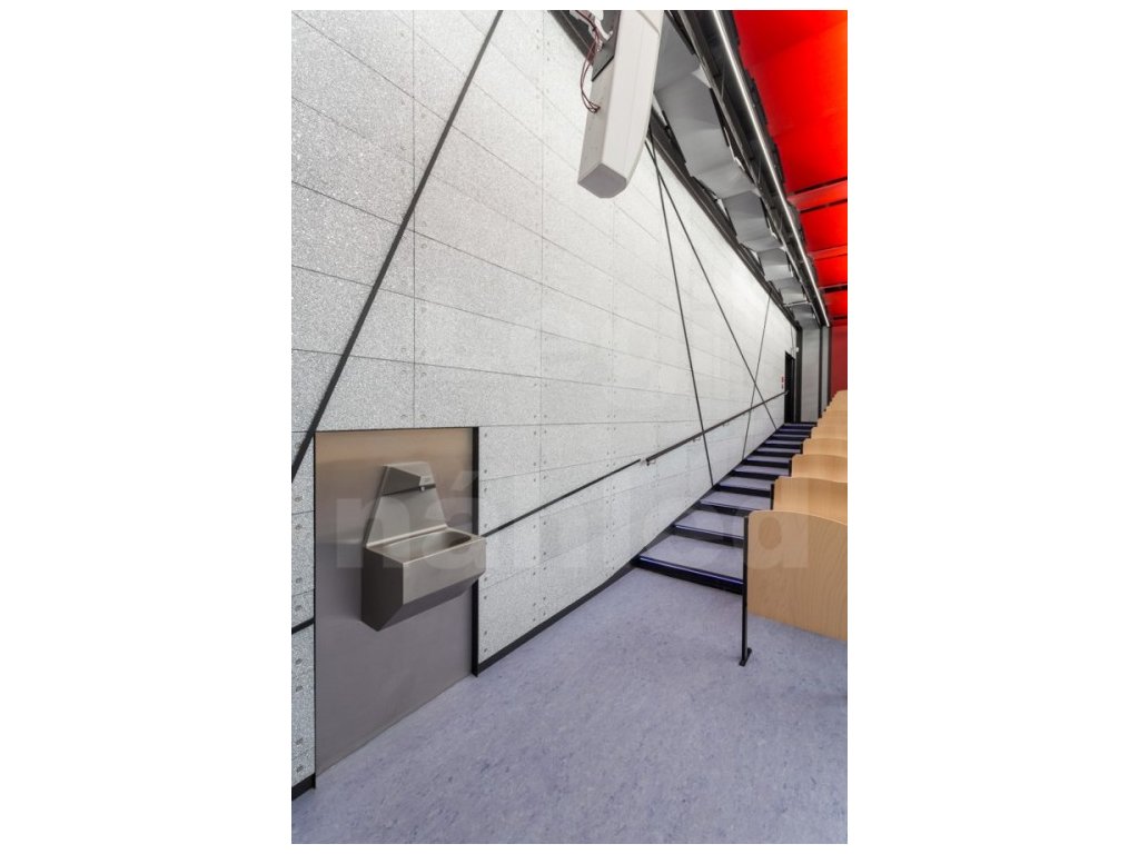 Obkladové panely z taveného recyklátu křišťálového skla. Celkem 300m2 ve třech posluchárnách fakulty architektury ČVUT v Praze.